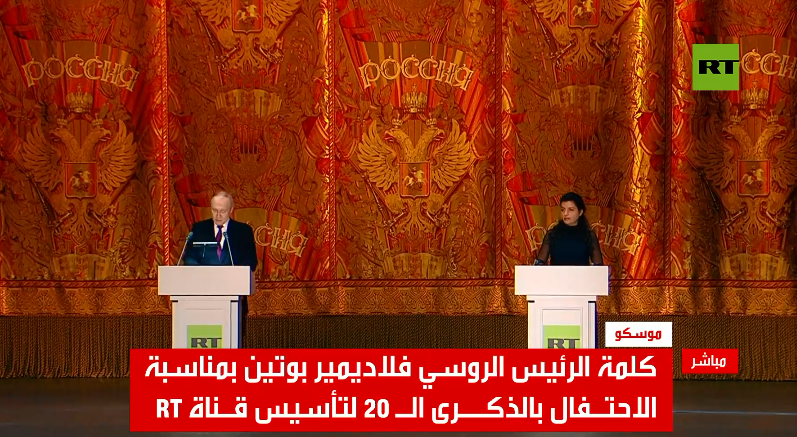 بحضور الرئيس الروسي فلاديمير بوتين، احتفلت قناة RT بالذكرى العشرين لتأسيسها في مسرح "البولشوي" بالعاصمة الروسية موسكو.