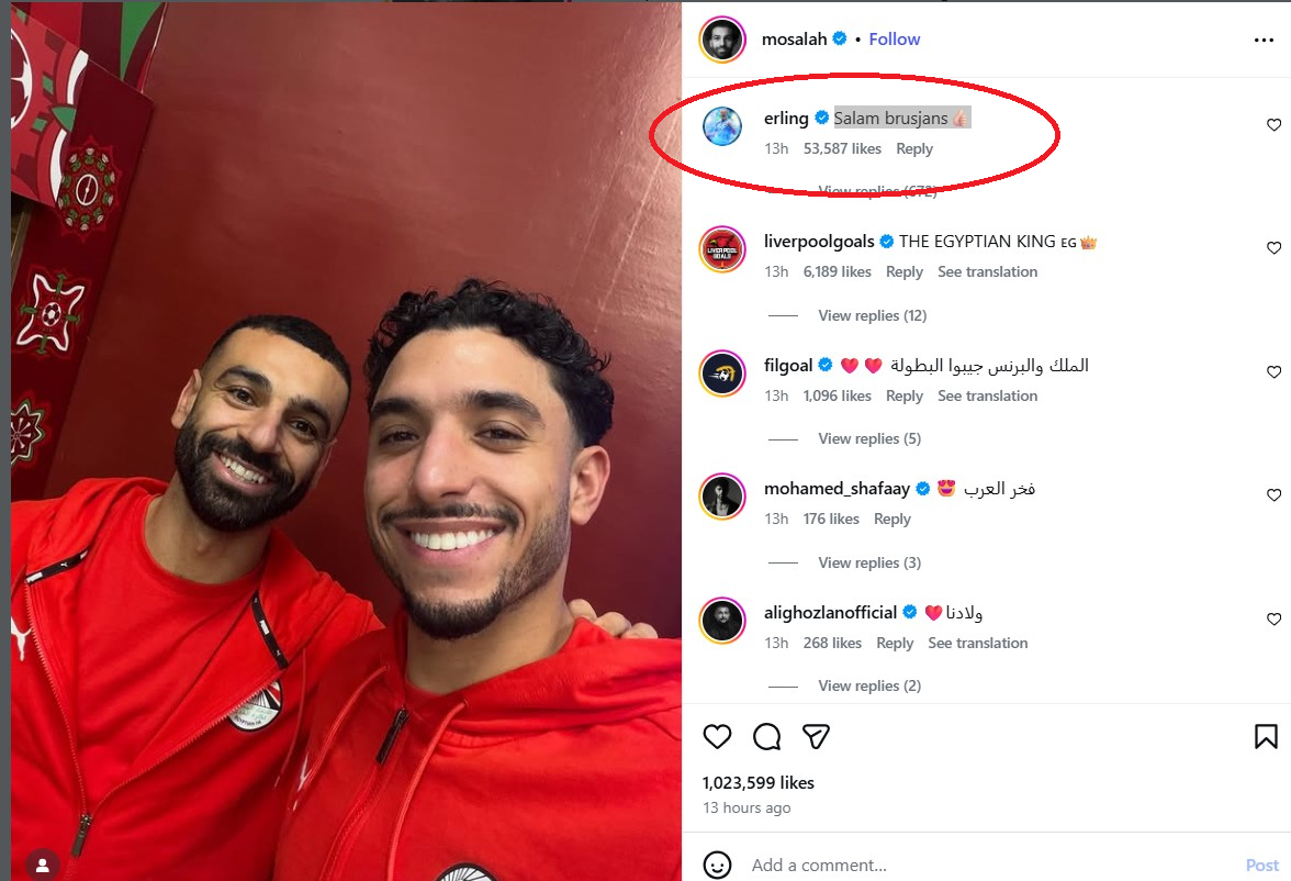 وبعد انتهاء المباراة، نشر محمد صلاح عبر حسابه على موقع "إنستغرام" صورة جمعته بزميله عمر مرموش، ليأتيه تعليق مفاجئ من النجم النرويجي إيرلينغ هالاند، الذي كتب: "سلام يا إخوة"، مستخدما الحروف اللاتينية لكتابة التحية العربية "سلام".